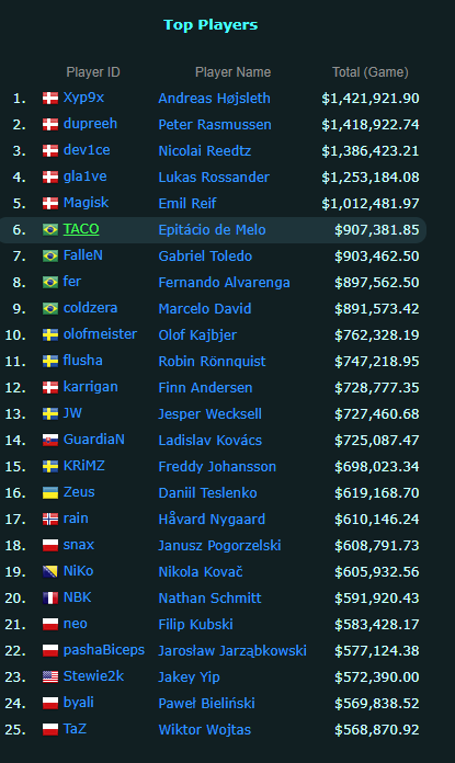 Xyp9x的职业生涯到目前为止共获得了超过142万美元的税前奖金,在他身后分别是他在Astralis的队友——dupreeh和dev1ce。由于gla1ve和Magisk的加入Astralis的时间较晚,这俩人的奖金目前在总榜单上分列第50和第67位,单奖金总数均已超过百万美金。