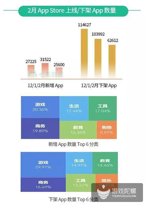2 月新增和下架 App 中,游戏、商务、生活三大类依旧占比较高,游戏类 App 下架数量占比近 30%,2 月下架量达 11092 款。生活、教育、工具、娱乐四类 App 在上架/下架数量占比相对均衡。