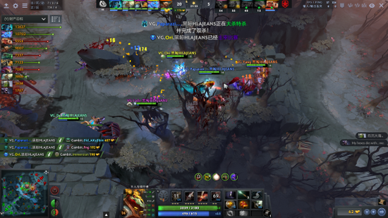 首局比赛Gmabit选出团控谜团加上火猫加剑圣双核,VG则是继续给Yang选出一直发挥不错的酒仙搭配幻刺跟NEC双核。对线期双方打得比较平稳,直到5分钟VG才依靠双酱油游中拿到一血,之后VG三线站稳仅靠打钱就慢慢与Gambit拉开差距,反观Gambit这边逛街赏金可以说毫无作用,Gambit完全就是一副人为刀俎我为鱼肉的状态。23分钟VG打掉肉山,幻刺狂战暗灭带盾超强一波直接在25分钟带走Gambit。
