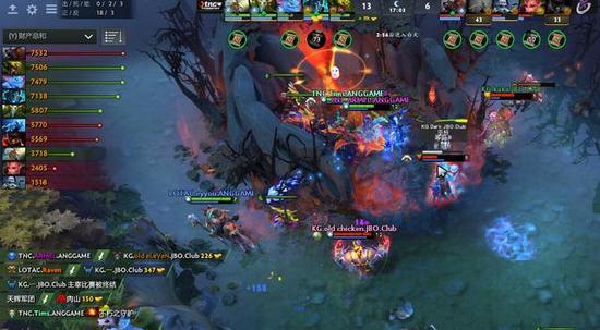 TNC四人抱团推塔,幻影刺客一人单刷。中路连续的塔战中,TNC连续击杀KG的三四五号位,中路一塔也交掉。中路二塔前,KG终于找到机会秒掉剧毒术士,末日使者大到帕克将其追死,算是打回来了一些。