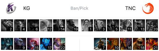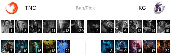 KG在天辉方,TNC在夜魇方,开局eLeVeN的暗夜魔王和对线Gabbi的噬魂鬼和Eyyou的陈,下路old chicken幻影刺客和Dark巫医对线Raven的蝙蝠骑士,中路狼哥大圣对线Armel灰烬之灵,Tims的莱恩和Kaka的邪影芳灵在中路挂了一会后一个来到下路,一个来到上路,最终仍是212的对线。