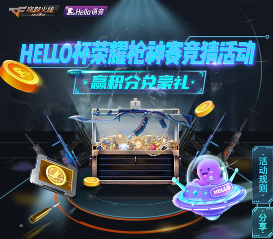 Hello语音在赛程中特别设置了比赛竞猜活动,参加竞猜即有机会获得AK47-枪王荣耀CDK和金币加成卡CDK,还可以赢取Hello精美座驾和金币!更多精彩内容,请加入活动群644866506或关注官方新浪微博@Hello语音 进行了解。