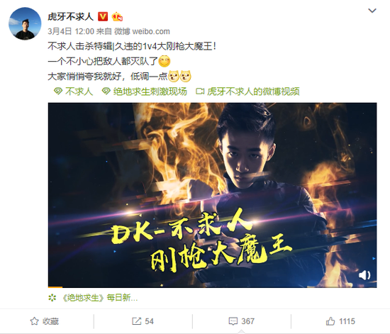 近日不求人在微博里公开求表扬,事情是这样的,不求人发布了一个名叫《久违的1V4刚枪大魔王》的击杀特辑,并称只想低调打游戏,还让粉丝也跟着低调,悄悄地夸他就好了。那么不求人为什么不敢让粉丝大张旗鼓地夸他呢?背后的原因让人哭笑不得。