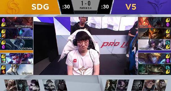 第36分钟,V5在SDG中路高地前开团,最终SDG团灭V5,卡莎完美输出斩获三杀。SDG击杀大龙后,带着大龙BUFF再度团灭V5,取得第一局比赛的胜利!