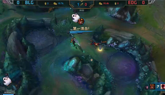 中期EDG很想用乌鸦的单线优势来和对面打团打开优势,但是由于自己阵容没有先手,加上BLG也是一场小心根本不给EDG机会,双方再度回到平稳发育期。