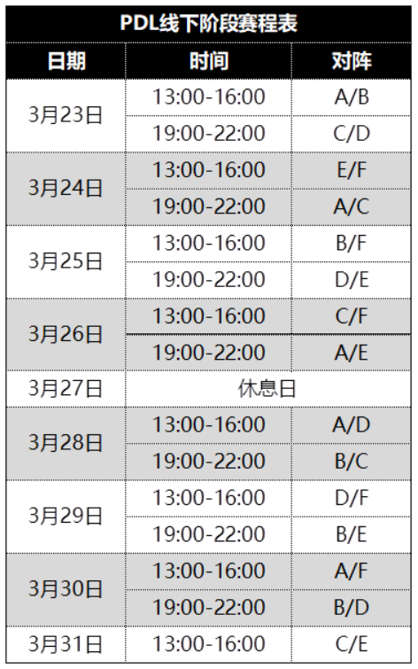 PDL春季赛线下赛的比赛时间为3月23日——3月31日,3月27日为休息日。除31日之外,其余比赛日的13:00——22:00为各队的比赛时间。紧密的赛程,超高强度的竞技频率,线下赛对于每个队伍来说都是一次生理和心理的双重挑战,想要获得最终的晋级名额,他们还需要进行更多的赛前准备。