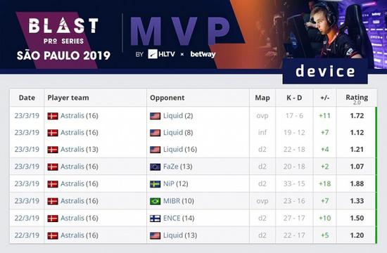 Device在本届赛事的贡献非常稳定,每一局的Rating值都达到1.0之上。当然除了Rating外,在多项数据中他也是位居榜首。ADR(88.1)、平均每回合击杀(0.86)、平均每回合阵亡(0.56)以及平均每回合AWP击杀(0.45)。