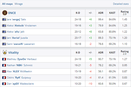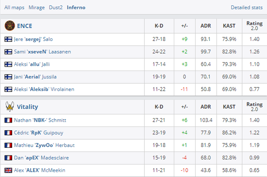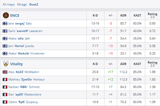 随后的比赛中,似乎运气也站在了法国人这边。原先队内的老六ALEX甚至在第13局时和上一局的sergej一样拿到了21个Frag。最终奋起追分的Vitality以11-4的比分优势领先,值得一提的是Aleksib在上半场一个人头未拿以0-14的战绩垫底,换边时他自己都忍不住笑了出来。来到下半场后芬兰人还是没能找到翻身的方法,书掉手枪及经济局的他们很快就以4-16的巨大比分负于对手,双方来到第三张决胜地图。