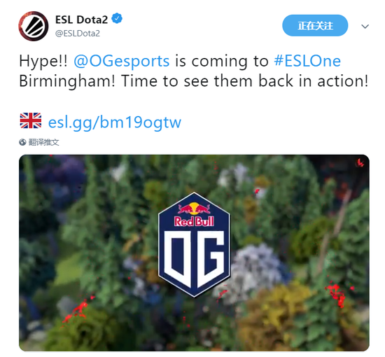 ESL One主办方公布了他们伯明翰站的第五支直邀队伍,TI8冠军OG。