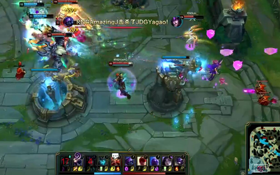 前中期RNG的三路应该说都是取得了优势,特别是jax装备成型后掘墓者的带线战术也无法施展,而蝎子正面团战也无法开到比较好的后排,导致RNG将竞技逐渐扩大。