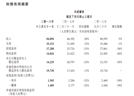 腾讯控股2018年四季度净利润142.29亿元,同比下滑32%;收入848.96亿元,同比增长28%。