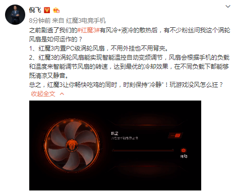 红魔3是全球首款采用风扇技术进行主动式散热的手机,并申请了专利,也就是说目前市面上只有红魔3这一款电竞游戏手机是内置风扇的。在散热这一块红魔3绝对占据了行业翘楚的地位。涡轮风扇相对传统的散热风扇,能在更小的空间占用下输出更大的风量,提升散热效果,在加工精度上较普通风扇也要求更高,但在高速运转时发出的噪音应该也会更大。不过努比亚倪飞的微博提到红魔3通过矢量控制技术,能使涡轮风扇获得更小的噪音,至于实际效果如何,在即将到来的4月份的新品发布会上就能见分晓。