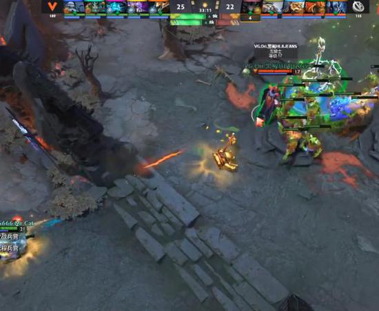 22分钟VG打掉肉山,蚂蚁带盾,同时喜欢看戏的末日也送出了自己的命。VG顺势推掉夜魇中路高地塔,由于兵线被敌法断了,VG只能撤退,可电狗当面TP让VP抓住了机会,蚂蚁盾毁人亡,神谕者和黑贤也死于非命,VG的经济优势不复存在。