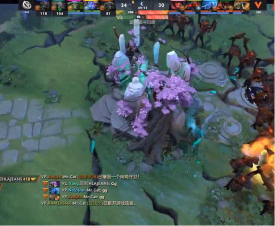 39分钟VP突袭中路,末日将大招给了蚂蚁,敌法师切入人群秒掉土猫神谕者和电狗,电狗土猫买活,VG重整旗鼓杀死了毒狗和电魂,VG打掉三代肉山,电魂带盾神谕带奶黑贤带上刷新碎片。