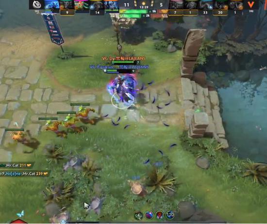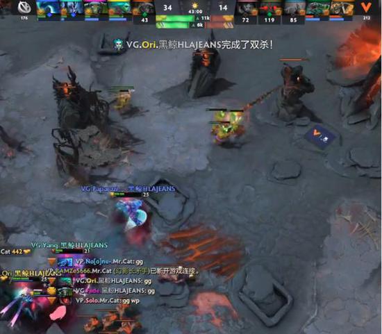 11分半下路的末日第七次支付,他的数据为0-7-0,忍无可忍的VP集合四人之力杀掉了下路的土猫。14分钟VG在抓到毒狗后拔掉了夜魇下路一塔。