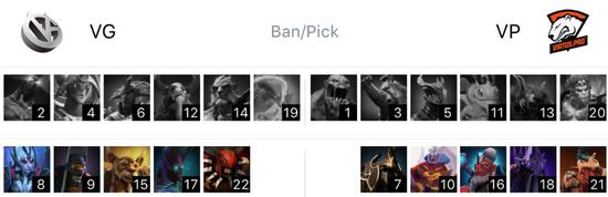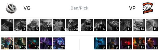 VG在天辉方,VP在夜魇方。分路方面,中路是美杜莎对阵水人。下路是电魂神谕者对阵末日萨满。上路是先知复仇之魂对阵狼人尸王。