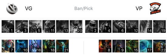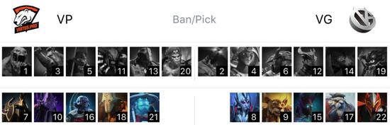 VG在天辉方,VP在夜魇方。分路方面,中路是死亡先知对阵电魂。下路是水人神谕者和土猫对阵萨满和潮汐。上路的复仇之魂对阵猴子和毒狗。