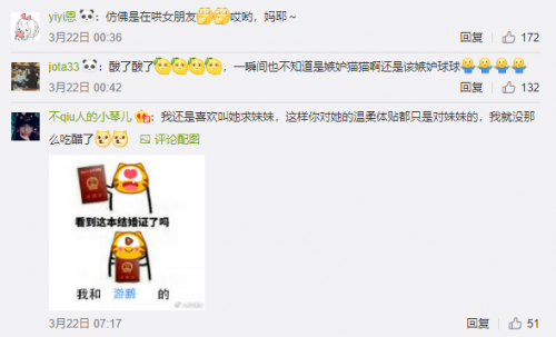 视频一出,有乐乐唯粉出来抱不平:“不求人的乐乐柯呢?”,也有乐乐和雪儿的团粉表示猫狗都喜欢。有粉丝在不求人与猫里不知如何选择,一时间不知道是嫉妒猫咪还是嫉妒求求。更多的是觉得不求人哄猫咪的样子简直就是哄女友,隔着屏幕变身柠檬精:“我还是喜欢你叫她求妹妹,这样你对她的温柔体贴都只是对妹妹的,我就没那么吃醋了。”