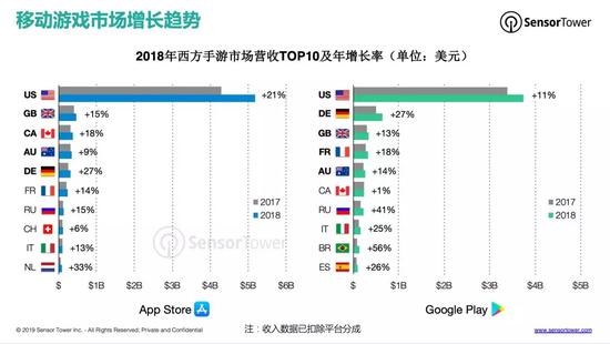 亚洲以外的移动游戏市场近年来仍保持约 20% 的营收增长速度,App Store 的市场份额仍领先于 Google Play。