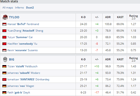 第二张地图是BIG强图dust2,不知是否是上局翻盘让TYLOO打出了信心,手枪局在先掉两人的情况下TYLOO再次赢下残局,XCC格洛克两发两头!来到长枪局后CY1更是在中门左右开弓连秒3人!TYLOO似乎回升了状态,连拿四分后tabseN也开始发挥,单人守住A大后连扳2分,然而TYLOO却突然在进入纯ECO时打了一个perfect翻盘,紧接着BIG的ECO局也险些翻盘成功,之后双方你来我往均有亮眼发挥和各种ECO翻盘,上半场比分最终锁定在BIG 6-9 TYLOO。