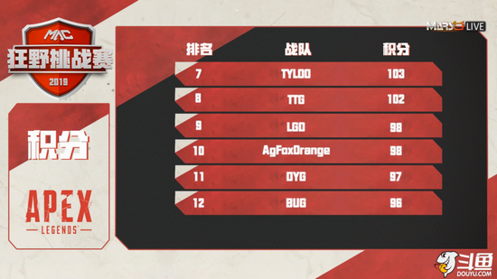 由Mars耀宇传媒主办,斗鱼直播平台独家播出,赛事官方指定显卡索泰赞助,迅游网游加速器赞助的Mars Apex 狂野挑战赛(Mars Apex Challenge),经过首周3月28日至3月31日的四天比赛,小组积分已经正式产生。TSG,Misty,V5战队目前领跑积分榜,基本锁定决赛名额。本周Mars Apex 狂野挑战赛将继续于4月4日至4月5日进行剩余8支队伍的排位赛,8强产生后4月6日至4月7日进行最终的决赛,决定20万元人民币奖金和冠军荣誉的最后归属,精彩不容错过!