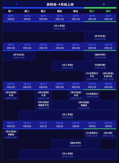 春季赛线上赛从4月8日持续到5月17日,为期一个多月的线上对决,更加充分地体现各款游戏对决的细节之处。同时,选手之间的激情对决时刻以及精彩操作也能得到更全面的展现。春季赛囊括以下游戏赛事项目:2019网易电竞X系列赛春季赛《阴阳师》春和演武战队赛、《第五人格》大师挑战赛、《非人学园》QwQ杯赛S3、《大话西游2》经典版天梯巅峰战年度总决赛、《大话西游2》免费版天梯巅峰战年度总决赛、《梦幻西游》电脑版三界之星邀请赛、《梦幻西游》手游第10届X9联赛、《楚留香》手游·名剑天下、《逆水寒》全民争霸赛、《我的世界》系列赛、守望先锋NeXT春季赛、《炉石传说》巅峰争霸赛、《星际争霸Ⅱ》战队对抗赛、《魔兽争霸Ⅲ》明星邀请赛、《拳皇14》亚洲明星邀请赛、《刀塔自走棋》全民争霸赛。官方专题页next.163.com全程呈现精彩赛事,战意激燃,即日上演!