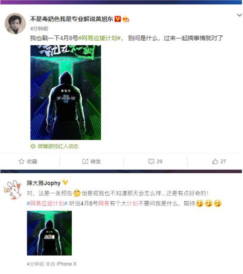 守望先锋名嘴ROY、阴阳师大触冰冷之海、第五人格顶级排位主播老三、我的世界小橙子姐姐、星际老男孩黄旭东等涉及10余款游戏的近40位游戏大神纷纷为“网易应援计划”发声。由于缺乏具体的内容信息,只有“4月8日”、“网易游戏”、“沸腾你的热爱 就在下一刻”几个关键点能在发布的海报和文案里找到,一时间“网易应援计划”在游戏圈内引发了众多讨论和猜测。