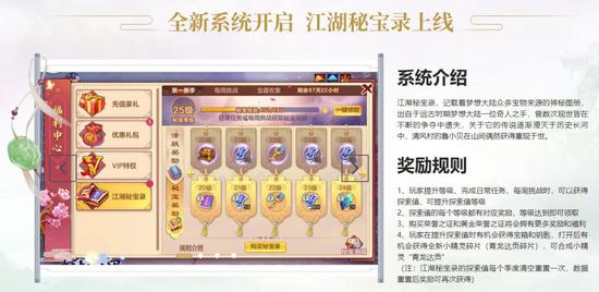根据官网信息显示,江湖秘宝录系统分为活跃奖励和秘宝奖励,通过日常任务、每周挑战等获得探索值,达到特定探索等级可以解锁超值奖励,而秘宝奖励则可以获得数倍于活跃奖励的物品,而且探索值每季度清空一次。