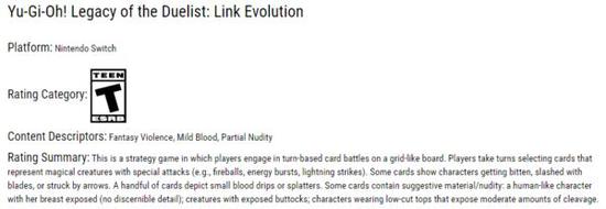 根据ESRB已有的分级信息,《游戏王:决斗者遗产》也是系列第一款被评为“青少年”级的游戏,其它作品则没有这么高的年龄限制。