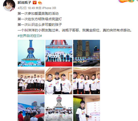 在参加了这次的“爱星奔跑”活动后,瓶子也是非常感慨地在个人微博上发表了心情,表示自己认识了很多可爱的孩子,第一次在东方明珠塔点亮了蓝灯。瓶子还提到了有一个小朋友主动来和自己聊天,也是一个王者荣耀的粉丝,希望瓶子能够为这些儿童带来更多的阳光和正能量。在如今十分浮躁的电竞圈中,瓶子还能够保持本心,在繁忙的赛事和直播中抽空参加这种公益活动,不愧是王者荣耀解说的牌面,希望他的爱心能够为这些儿童们撑起一片天。