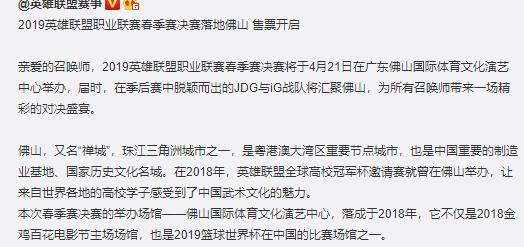 2019英雄联盟职业联赛春季赛决赛落地佛山 售票开启