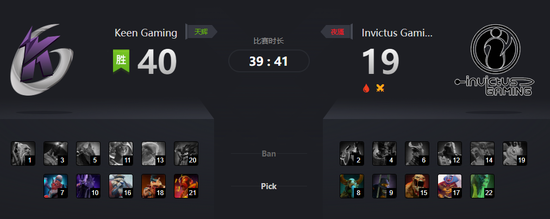 37分钟,IG抓住巨魔没复活的机会试图偷盾,但KG很警觉,巨魔买活,海民抢盾,火猫抢掉奶酪,团灭IG!KG瞬间获得了15K的经济优势,破掉了IG中路高地。随后KG转推下路,IG不打算放弃交出了所有买活,但还是被KG打成团灭。IG不甘地打出了GG。