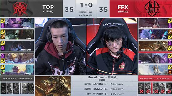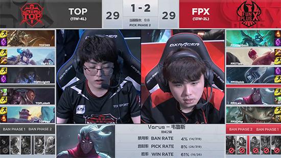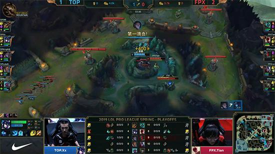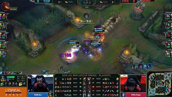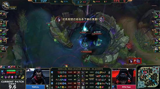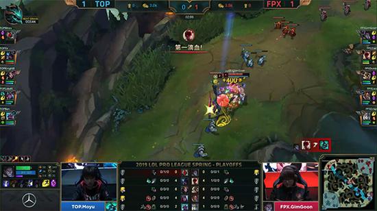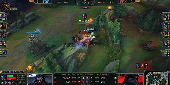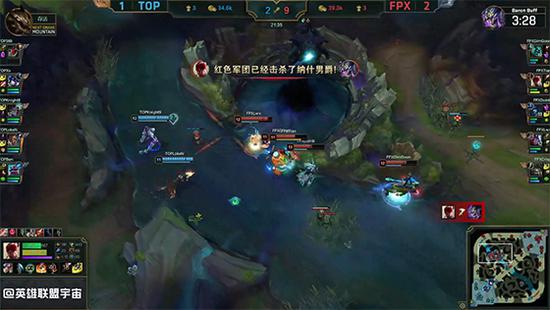 28分钟上路团战,TOP击杀FPX三人,随后一波推掉主水晶,1-0暂时领先。