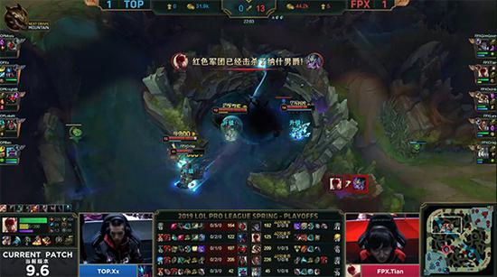 FPX携带大龙buff中下路同时推进,TOP中辅阵亡,FPX破掉中路水晶和一座门牙塔。28分钟大龙河道团战,FPX击杀TOP4人,仅塞拉斯幸存。FPX最终一波结束比赛,3-1TOP获得2019LPL春季赛季军。