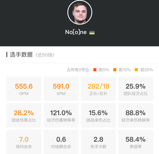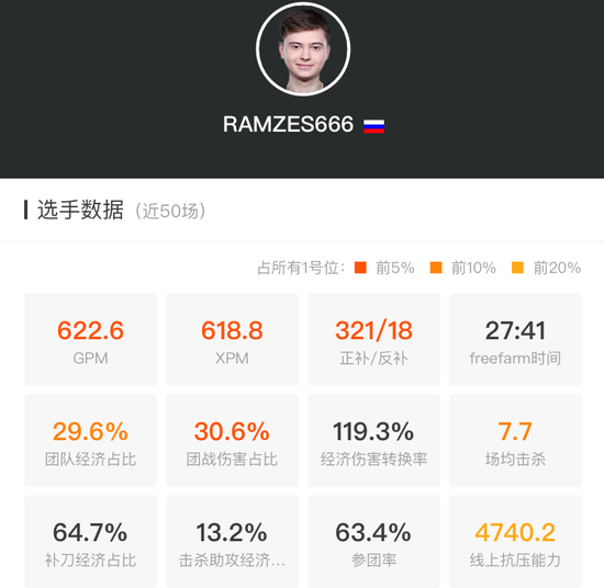 由于长着一张娃娃脸,很多观众都会对666的年龄产生疑惑。事实上,出生于99年的他现在已经20岁了。这个年纪的人在传统行业中或许还是初出茅庐的新手,但在DOTA的世界里,666却是一名久经沙场的老牌Carry。622的GPM和618的XPM位居所有职业一号位的前5%,这足以证明666的基本功不是一般的扎实。平均每局321个正补,让队友不寒而栗。当然,真正引起人们注意的,自然是高达30%的团战伤害占比。这样的伤害占比稳居一号位的前5%,要想达到这个数据,可不是出山后打打输出就能做到的。事实上,666的节奏从前到后贯穿始终。他的幽鬼是这样、他的TB是这样,甚至连他的敌法也是如此。
