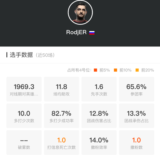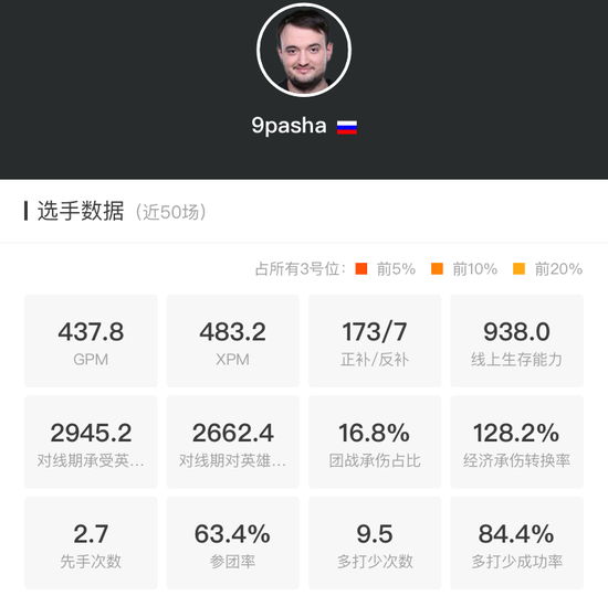 9pasha是整支队伍里最被低估的那个人,而之所以会受到这样待遇,也确实因为他的失误次数比其他四名选手都高出一截。特别是在上个Major的总决赛,9pasha的白给让VG找到了击败VP的方法。都这么说了,9pasha的数据肯定不会好看到哪里去。其中,GPM、XPM和一些常规数据的表现都很一般,63.4%的参团率也只是勉强够看。不过,9pasha的以多打少成功率倒是很惊人——84.4%!原来是个残局高手,这点我在看比赛的时候还真的没注意。