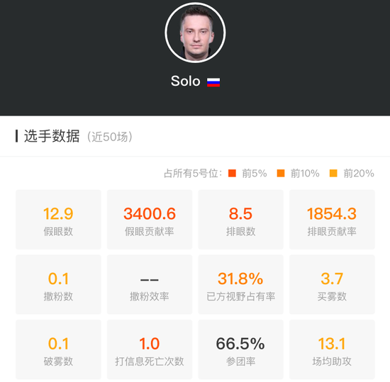爆眼王、送死怪、行走的五号位教科书,Solo对VP的贡献就像他的数据一样惊人——假眼贡献率3400(注:假眼贡献率=放置假眼数量*假眼存活时间),领先于职业比赛中几乎所有的五号位!己方视野占有率接近32%,这下总算知道为什么VP的先手那么准确了。排眼贡献率1800,在这个数据上能强过Solo的五号位选手不足10%(注:排眼贡献率=在自己提供真视视野时,排掉的真/假眼数量*被排眼的剩余存活时间)。当然,除了在辅助道具方面的贡献外,Solo也以13个场均助攻在辅助选手中名列前茅。至于英雄池,Solo哥不仅有他最擅长的萨尔、Bane,最近几场也把神谕和VS练的炉火纯青。