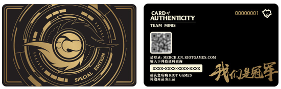 每个手办的底座都刻有iG选手的专属签名,除此而外,iG冠军迷你手办套装的防伪卡为iG特别定制款,正面为黑金色iG战队LOGO,背面则印有LPL广为流传的那句口号:我们是冠军!