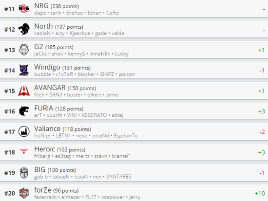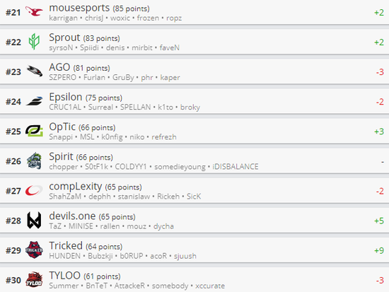 另外,换新阵的 mouz 也在缓慢上升中,由于近期推掉了几个大赛,积分并无太大涨幅,目前位于第21名。