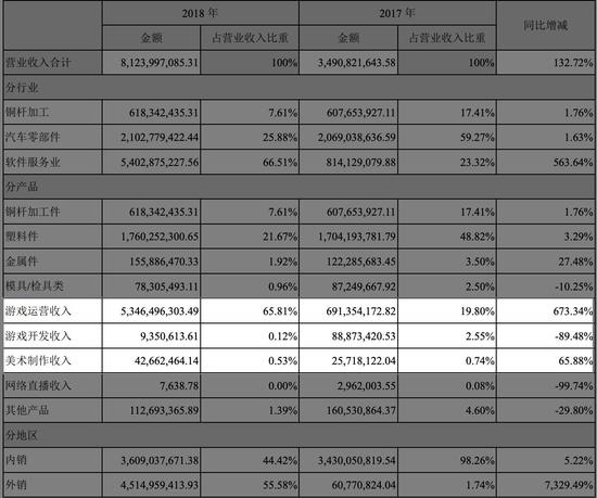 观察世纪华通在2018年的收入构成,我们发现游戏运营这一模块为其带来了53.46亿元的收入,这个数字占总收入的65.81%,同比大涨673.34%。