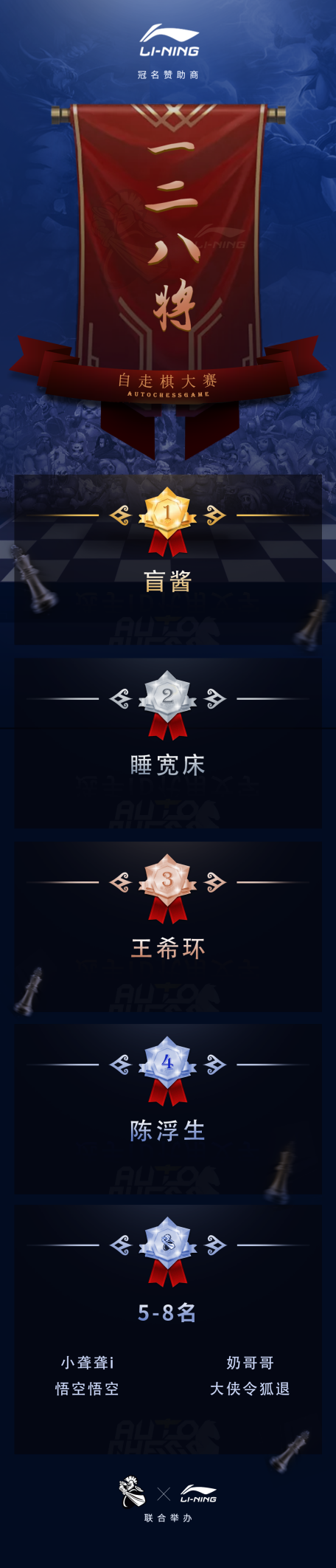 由Newbee携手李宁共同举办的“128将”自走棋大赛终于在今日落下了帷幕。从最初的16组选手到最终局的8强席,选手们热情高涨,厮杀激烈。现在就让我们一起来看看是哪些选手最终突出了重围,成为了最后的“大赢家”吧!