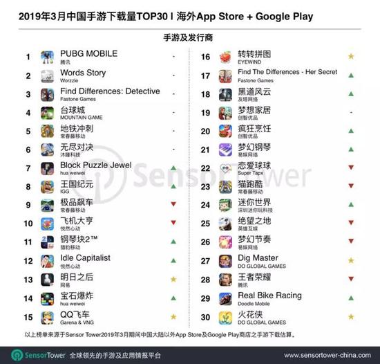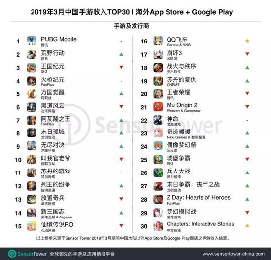 以下为3月Sensor Tower国产出海手游收入、下载榜TOP30: