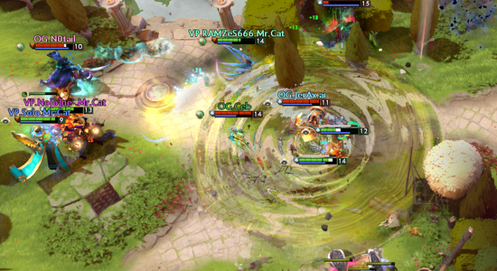 第一局比赛,VP在对线期积累的所有优势在20分钟的肉山团战后荡然无存。那一次,大爹的亚巴顿开启大招吃光了VP的第一轮技能,让Topson的火猫得以随意发挥。顺便一提,其他队伍的五号位亚巴顿都是在线上用一技能加血保大哥,可大爹却反其道而行之——用迷雾缠绕耗对面的血!两局比赛,666和9pasha都被大爹耗得够呛。回到第一把,22分钟的野区遭遇战,由于NoOne被沉默后什么技能都放不了,VP未能在第一时间击杀Ana的黑弓。残局,JerAx的牛头跳出完美大招,VP瞬间团灭。这之后,黑弓便带领队伍扫平了VP的高地。