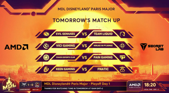 明天,就是本次MDL巴黎迪士尼Major的第四个比赛日,即淘汰赛的第二天。和今天一样,首先进行的是胜者组的两场BO3,随后则是败者组的两个BO1。胜者组方面,EG将会与液体碰面,VG则会同NIP展开激战。尽管在小组赛阶段,VG与EG都展现出了超强的实力。但就淘汰赛第一天的剧情来看,“欧洲对抗世界”确实已经成为了本次Major的主旋律。若是放在一个月前,NIP绝对不是VG的对手。但鉴于他们在上个Minor的决赛中有过相当惊人的表现,我也不想把话说的太死。至于液体,他们在某种程度上算是把握住了当前版本赢比赛的诀窍——啥都不管,推就完事了!EG真的能挡住来自液体的推进狂潮吗?我深表怀疑。