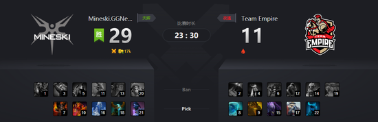 今天的最后一场比赛,阿杰的火猫令人忍俊不禁。当时,阿杰竟然想用火猫的三魂撞死对面的水人,怕不是在把帝国的人当傻子。在火猫放魂的一瞬间,水人就开启了转血。三魂撞完,水人屹立不倒,阿杰则惨遭反杀。阿杰打成这样,Mski能赢多亏Kpii和Moon没掉链子。中期团战,Mski以ninjaboogie的冰魂为诱饵,将帝国团灭。拿下一代肉山后,Moon的TA很快便就滚起了雪球。中路乱战,帝国的水人被大骨灰克的生活不能自理。23分钟,帝国缴械投降。