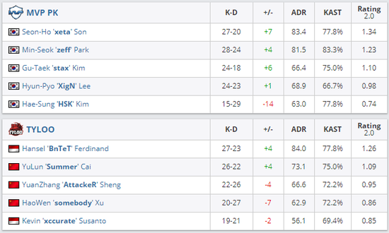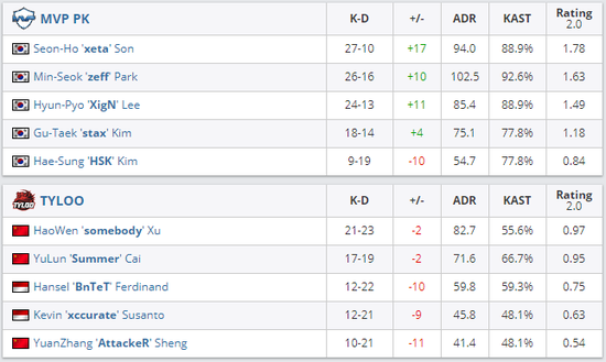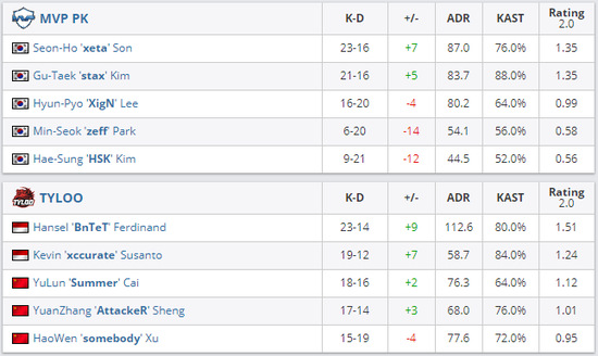 下半场TYLOO拿下手枪局后逐渐将比分扳平,双狙防守取得成效后连续得分以15-14先拿到赛点,但常规时间最后一回合stax站出来拯救了队伍,拿到三杀将比赛拖入加时,加时赛中MVP.PK笑到了最后,最终以19-17拿下第一图,总比分2-0领先。