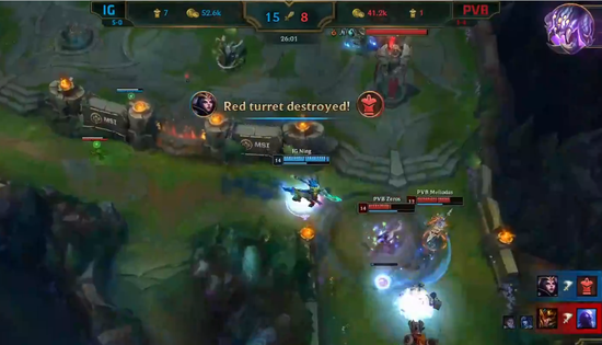 而随后的两分钟PVB几个C位都出现了致命的失误,被iG赚到了太多。25分钟iG轻松冲上高地。