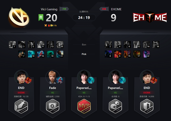 22分钟VG拆掉下路二塔和火锅之后准备上高,结果EH先冲出来秒掉了水人的盾,结果火猫和莱恩都被VG留住击杀,VG杀上高地拆掉了中路和下路的兵营。正当VG准备撤退的时候TA终于刷出BKB来参第一波团,但是潮汐一个S大把TA的BKB骗了出来。随后VG等TA没BKB了之后一波打灭了EH,EH看这把已经没得打了只能敲出GG。