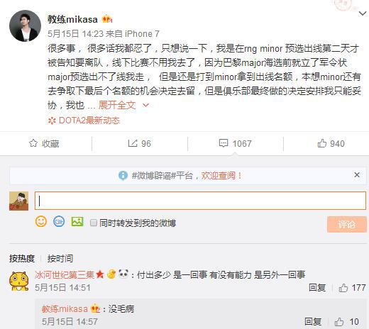 很多事, 很多话我都忍了,只想说一下,我是在rng minor 预选出线第二天才被告知要离队,线下比赛不用我去了,因为巴黎major海选前就立了军令状major预选出不了线我走, 但是还是打到minor拿到出线名额,本想minor还有去争取下最后个名额的机会决定去留,但是俱乐部最终做的决定安排我只能妥协,我也无怨言! 大哥们 我已经不怎么发比赛微博了,嘴轻点 饶了我,我没得罪你们什么!我这两年在队伍也没有划过水。也从来没有混吃等死过,跟我在一个队伍的选手都明白 对dota这款游戏的热爱和付出 我不比任何选手少,我很爱它 被黑这么久没有反驳,是因为我觉得没必要解释,做为男人就用行动去证明,说再多也没有意义, 一直坚持 是因为我也有我自己的梦想和目标。