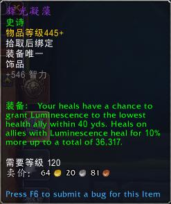 装备:你的治疗法术有一定几率获得辉光,治疗40码内最低血量的盟友,10%以上生命值,最多总计36317点。